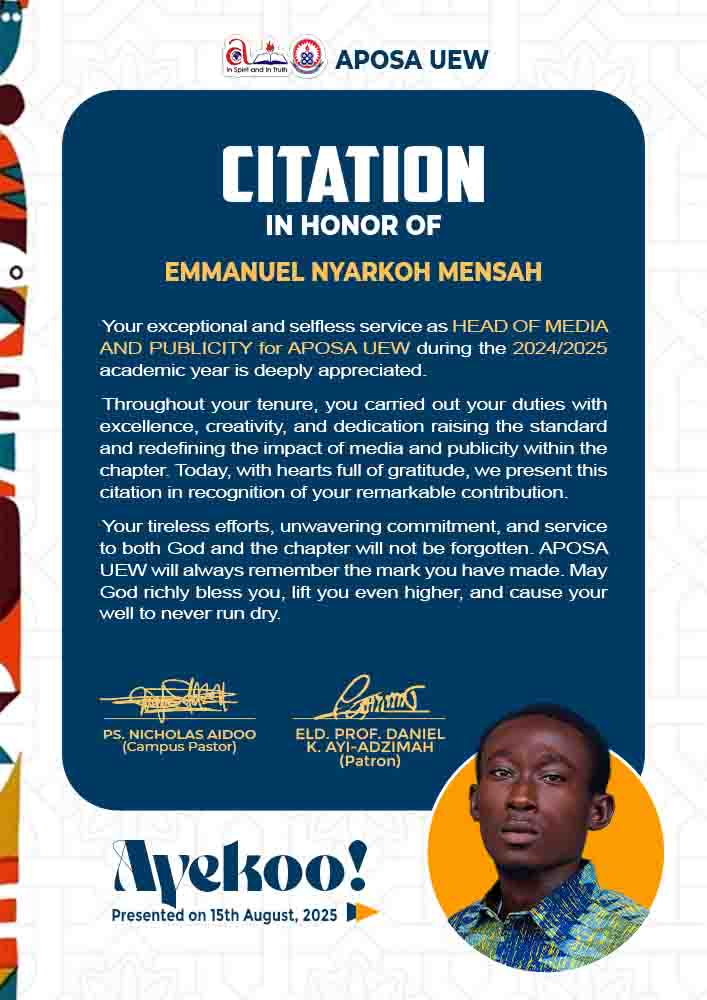 Your exceptional and selfless service as HEAD OF MEDIA AND PUBLICITY for APOSA UEW during the 2024/2025 academic year is deeply appreciated.